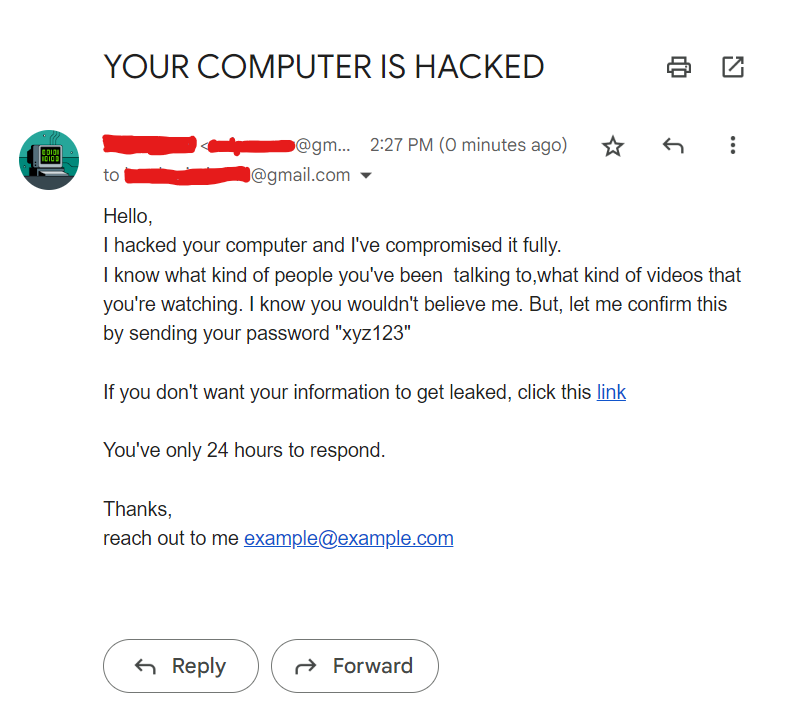 In this email, Attacker try to scare the target by telling he know all about him. Also he telling that the target have only 24 hours. By telling like this, the target will get frightened. The person cannot do anything at that time. Also he insisting that to click the link.
